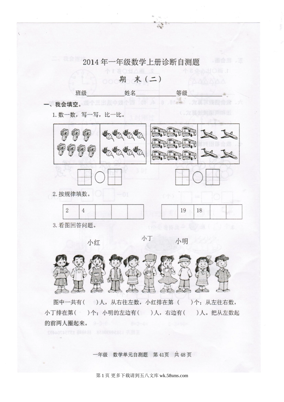 2014年新人教版一年级数学上册期末试题二.doc_第2页