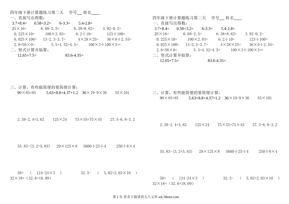四年级下册计算题练习第一天学号姓名一、直接写出得数:2.7+6.3=0.58+3.5=6-2.2=5.6-2.8=25×12=6.68-2.1=6.38+5.62=3.92-0.9=0.25×10=100×2.003=62÷10=123.5÷100=9.025×100=9-2.3-3.7=4×31×25=28×0÷54=...