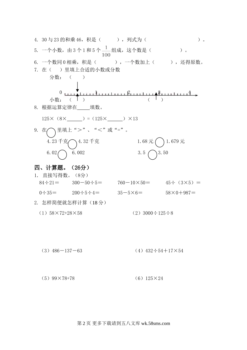 四年级数学下册期中检测试卷一、选择题:(请将正确答案的序号填在括号里)每题1分,共5分。1.下列算式中,运用乘法交换律使运算简便的是()。A、64×101B、125×66×8C、352×5×22.一辆汽车一次运大米6吨,增加...