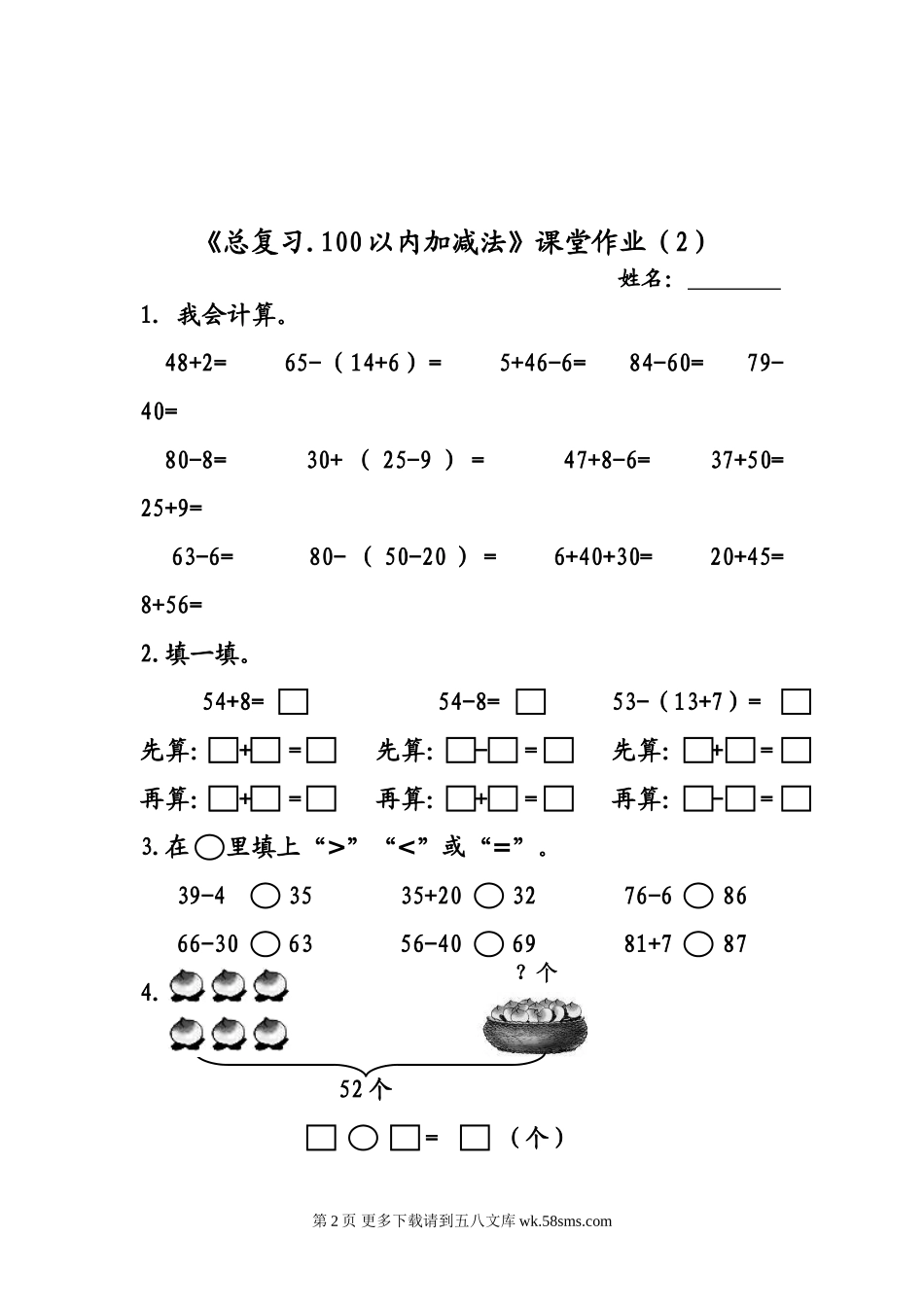 《总复习.100以内数的认识》课堂作业(1)姓名:1、我会填空。(1)(2)①46里面有()个十和()个一。②一个两位数,个位和十位上的数都是9,这个数是(),比这个数多1的数是()。③50的前面一个数是(),(...
