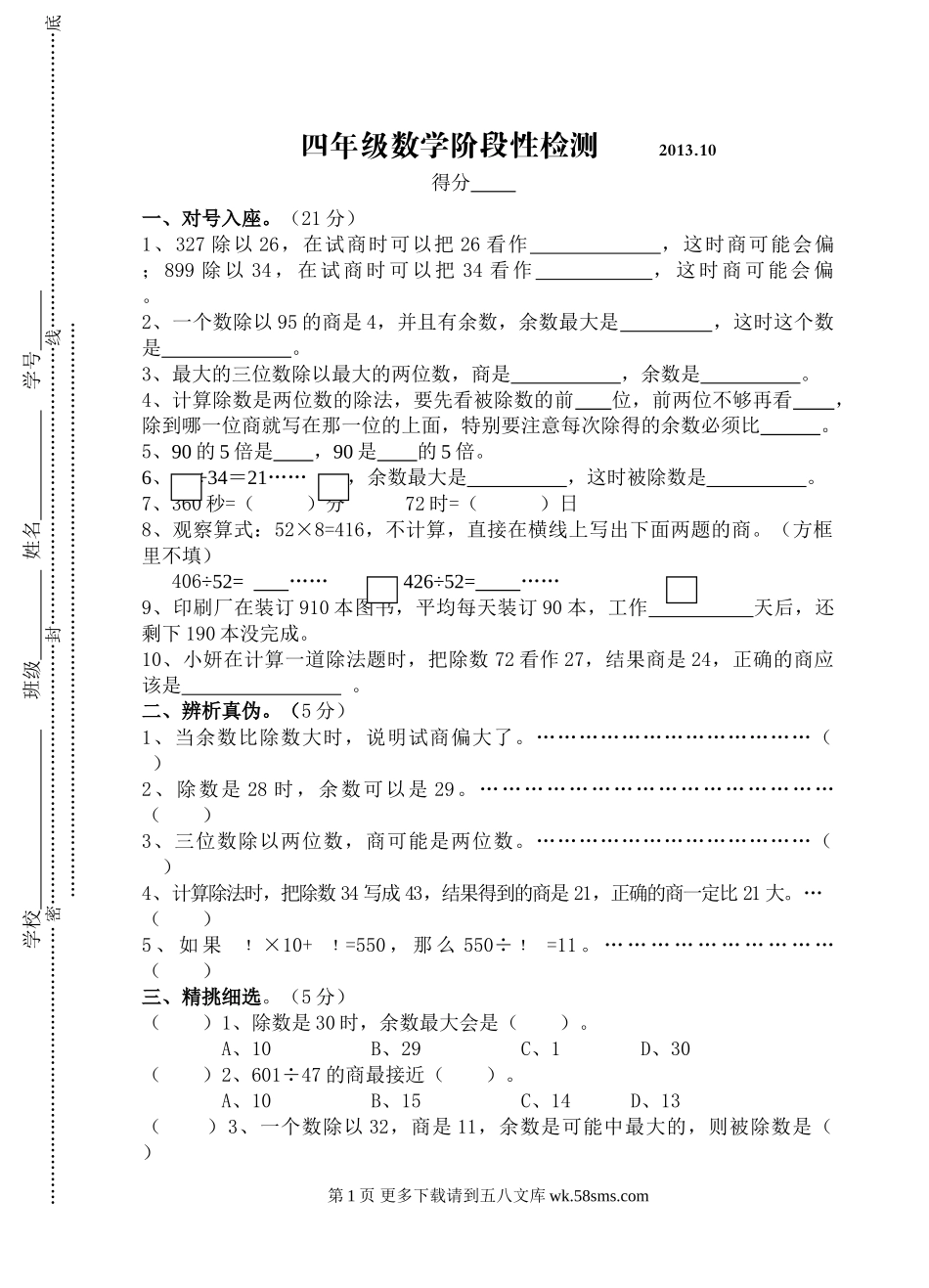 四年级数学阶段性检测2013.10得分一、对号入座。(21分)1、327除以26,在试商时可以把26看作,这时商可能会偏;899除以34,在试商时可以把34看作,这时商可能会偏。2、一个数除以95的商是4,并且有余数,余数最...