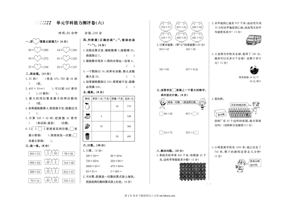 四年级数学2015-2016学年第一学期单元学科能力测评卷(六).doc_第1页