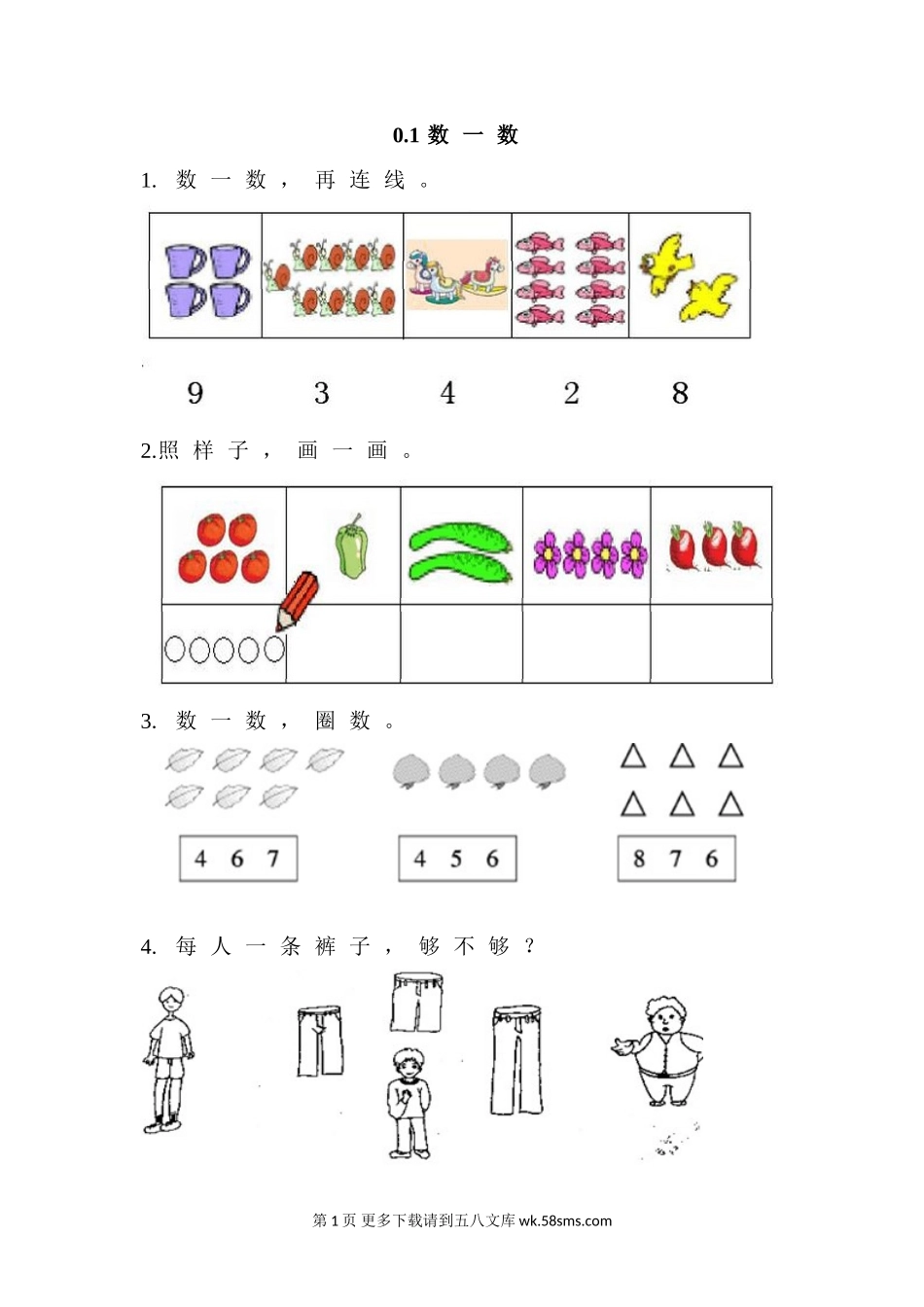 0.1数一数1.数一数,再连线。2.照样子,画一画。3.数一数,圈数。4.每人一条裤子,够不够?第1页更多下载请到五八文库wk.58sms.com答案1.2.○○○○○○○○○○3.7464.够第2页更多下载请到五八文库wk.58sms.com