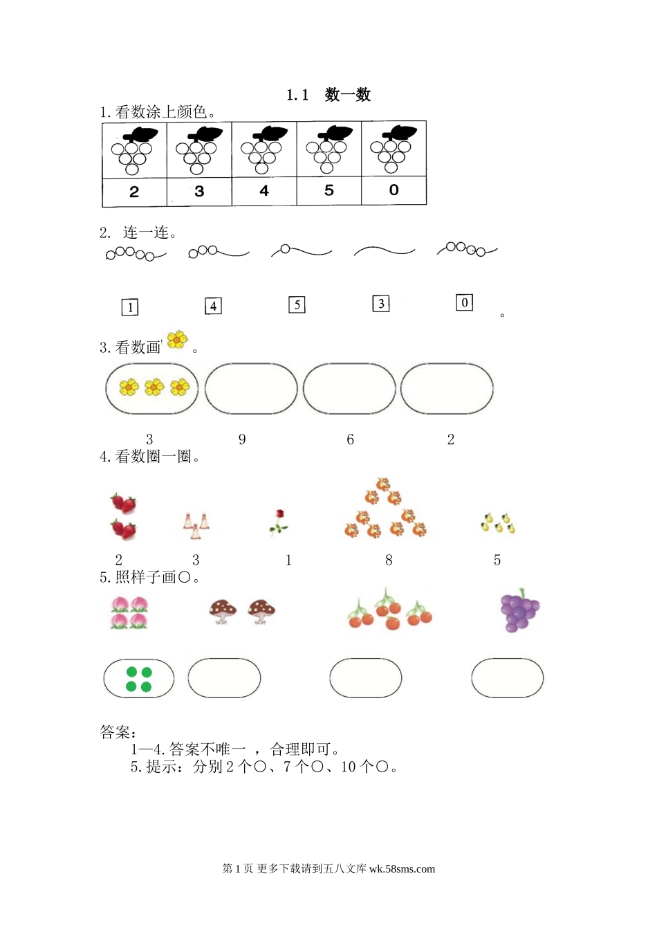 1.1数一数1.看数涂上颜色。2.连一连。。3.看数画。39624.看数圈一圈。231855.照样子画○。答案:1—4.答案不唯一,合理即可。5.提示:分别2个○、7个○、10个○。第1页更多下载请到五八文库wk.58sms.com
