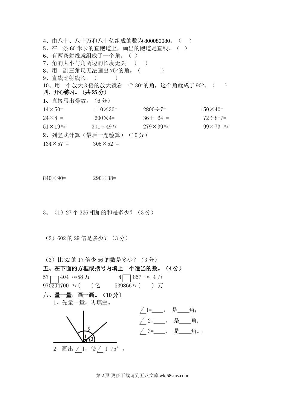 2014-2015学年度第一学期中期质量检测试卷四年级数学学校:年级:姓名:一、想一想,填一填。(22分)1、六百零七万零五十五的最高位是(),它是()位数,写作()2、人的血管总长约40000000米,写成用“万米”...