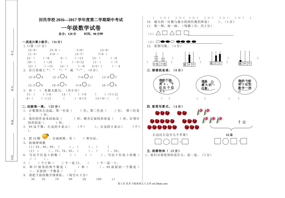 回民学校2016—2017学年度第二学期期中考试一年级数学试卷总分:120分时间:90分钟一.我是计算小能手。(31分)1.口算(17分)12-6=15-9=5+8=14-9=11-3=4+9=13-7=7+6=12-()=64+()=1315-()=810+()=10()-...