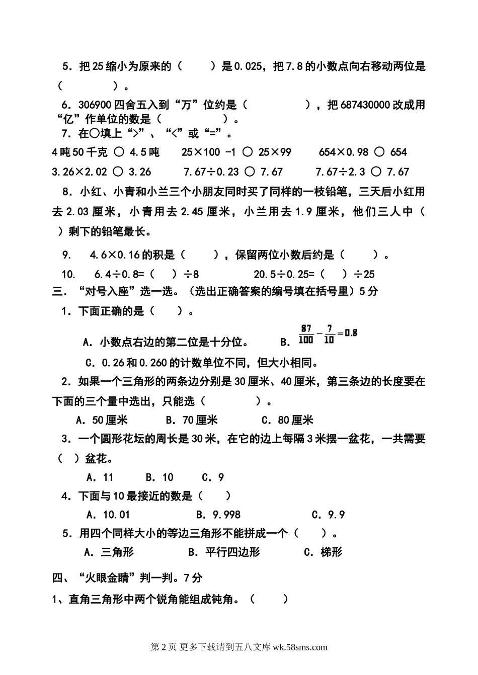 2011学年第二学期四年级数学期末质量检测试题(70分钟)一、“神机妙算”对又快:(31分)1.直接写出得数:5分2.65+0.73=2.12-0.9=0.54-0.45=0.6×0.9=125×0.8=0.32×0.5=0.12÷0.3=2.4÷0.004=1÷0...