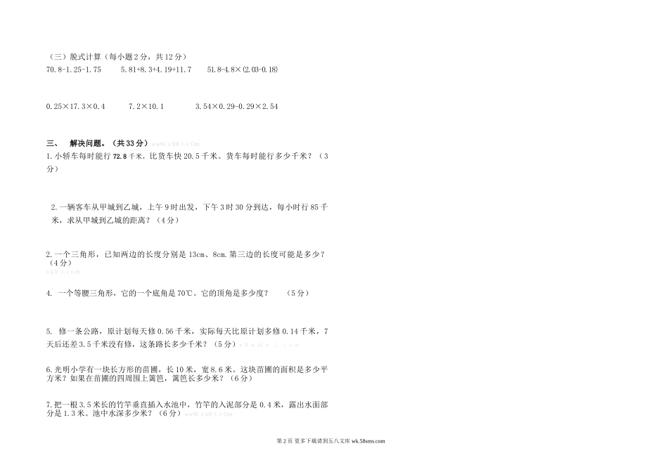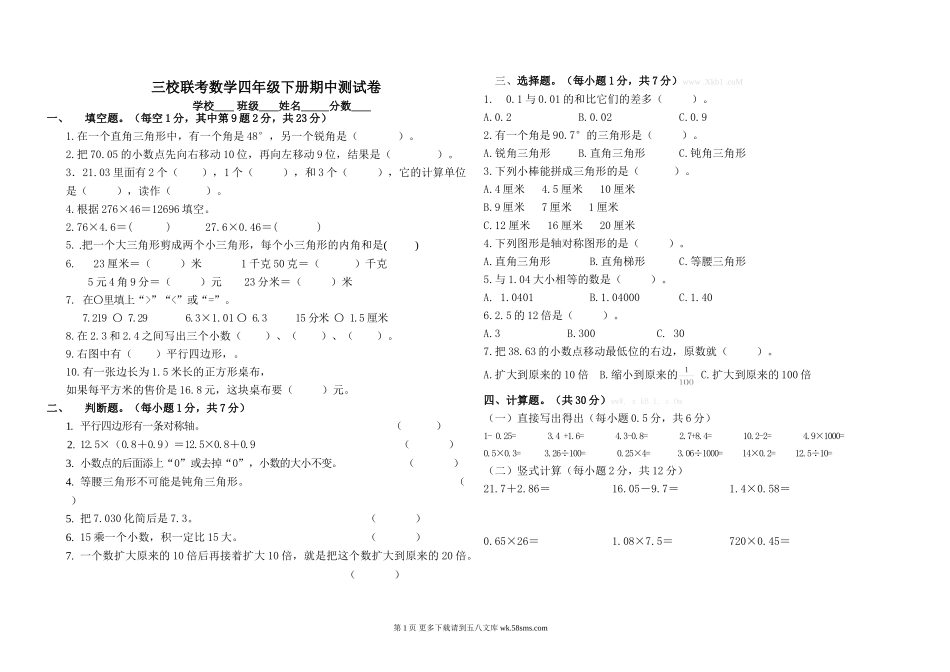 三校联考数学四年级下册期中测试卷学校班级姓名分数一、填空题。(每空1分,其中第9题2分,共23分)1.在一个直角三角形中,有一个角是48°,另一个锐角是()。2.把70.05的小数点先向右移动10位,再向左移动9位,...