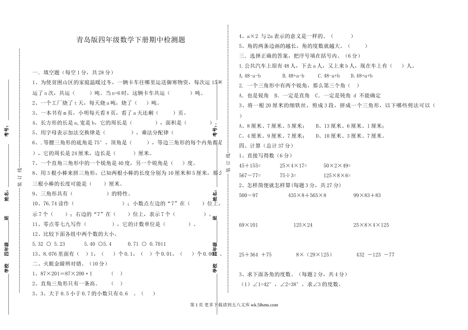 青岛版四年级数学下册期中测试题及答案.doc_第1页