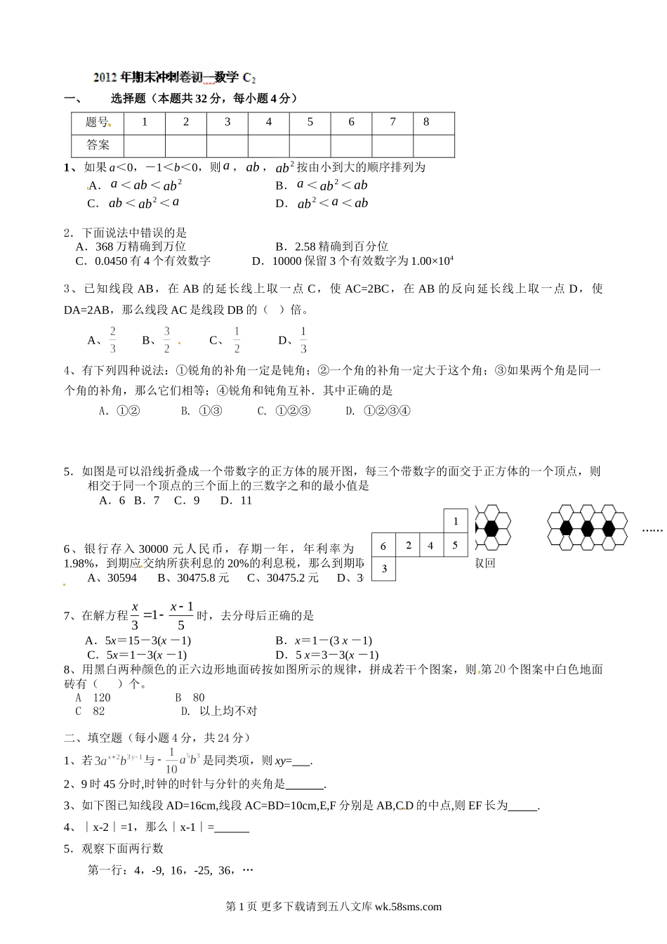 一、选择题(本题共32分,每小题4分)题号12345678[来源:学+科+网]答案1、如果a<0,-1<b<0,则a,ab,2ab按由小到大的顺序排列为A.a<ab<2abB.a<2ab<abC.ab<2ab<aD.2ab<a<ab2.下面说法中错误的是...