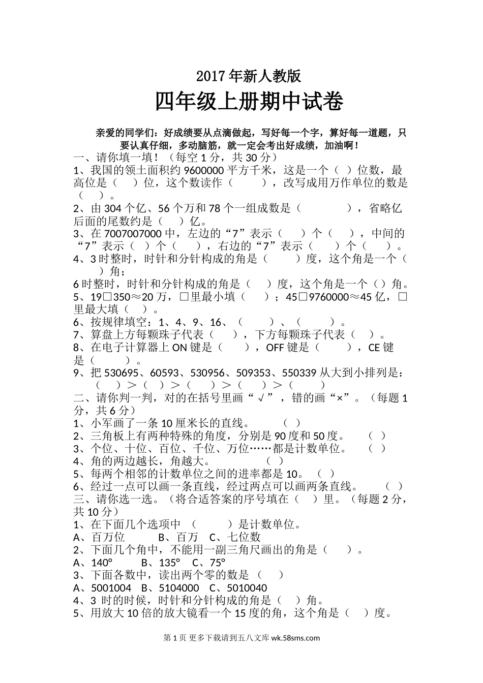 2017年新人教版四年级上册期中试卷亲爱的同学们:好成绩要从点滴做起,写好每一个字,算好每一道题,只要认真仔细,多动脑筋,就一定会考出好成绩,加油啊!一、请你填一填!(每空1分,共30分)1、我国的领土面...