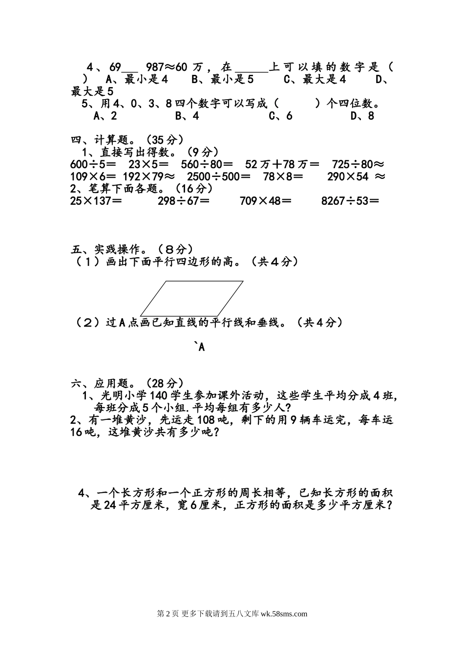 北师大四年级数学上册计算比赛试卷.doc_第2页
