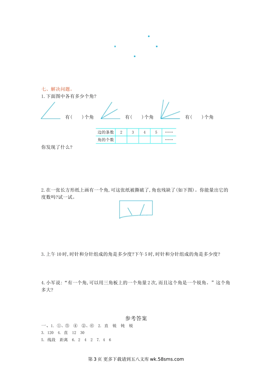 第三单元测试卷一、填空题。1.把序号填在括号里。图中,()是直线,()是射线,()是线段。2.三角板上都有一个()角,两个()角;红领巾上有一个()角,两个()角。3.度量一个角,角的一条边对着量角器上内圈刻度“180”,另一条...