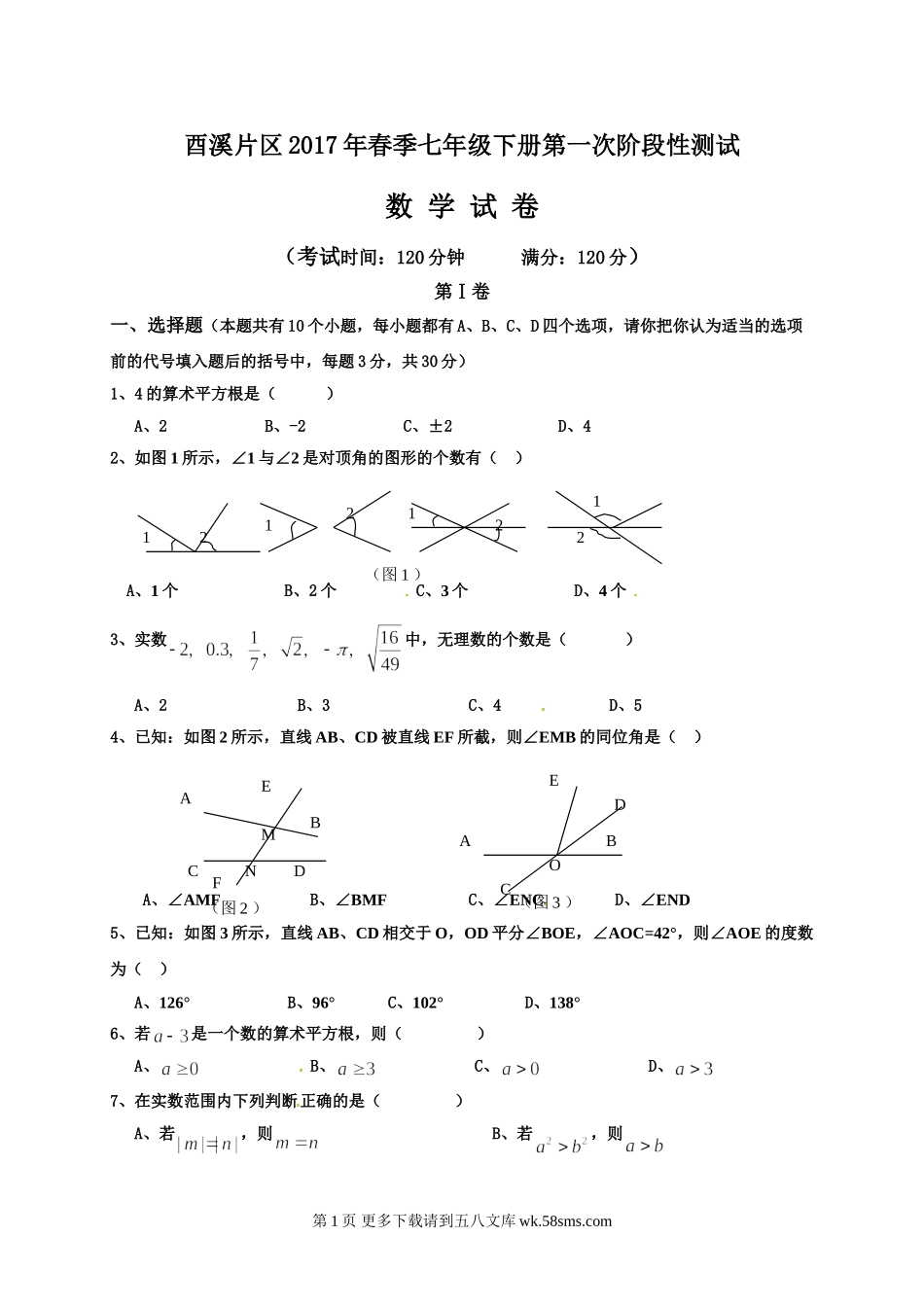 酉溪片区2017年春季七年级下册第一次阶段性测试数学试卷(考试时间:120分钟满分:120分)第Ⅰ卷一、选择题(本题共有10个小题,每小题都有A、B、C、D四个选项,请你把你认为适当的选项前的代号填入题后的括号中...