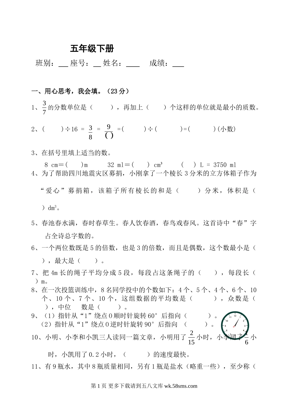 五年级下册一、用心思考,我会填。(23分)1、73的分数单位是(),再加上()个这样的单位就是最小的质数。2、()÷16=83=9=()÷()=()(小数)3、在括号里填上适当的数。8cm=()m32ml=()cm³()L=3750ml4、为了...