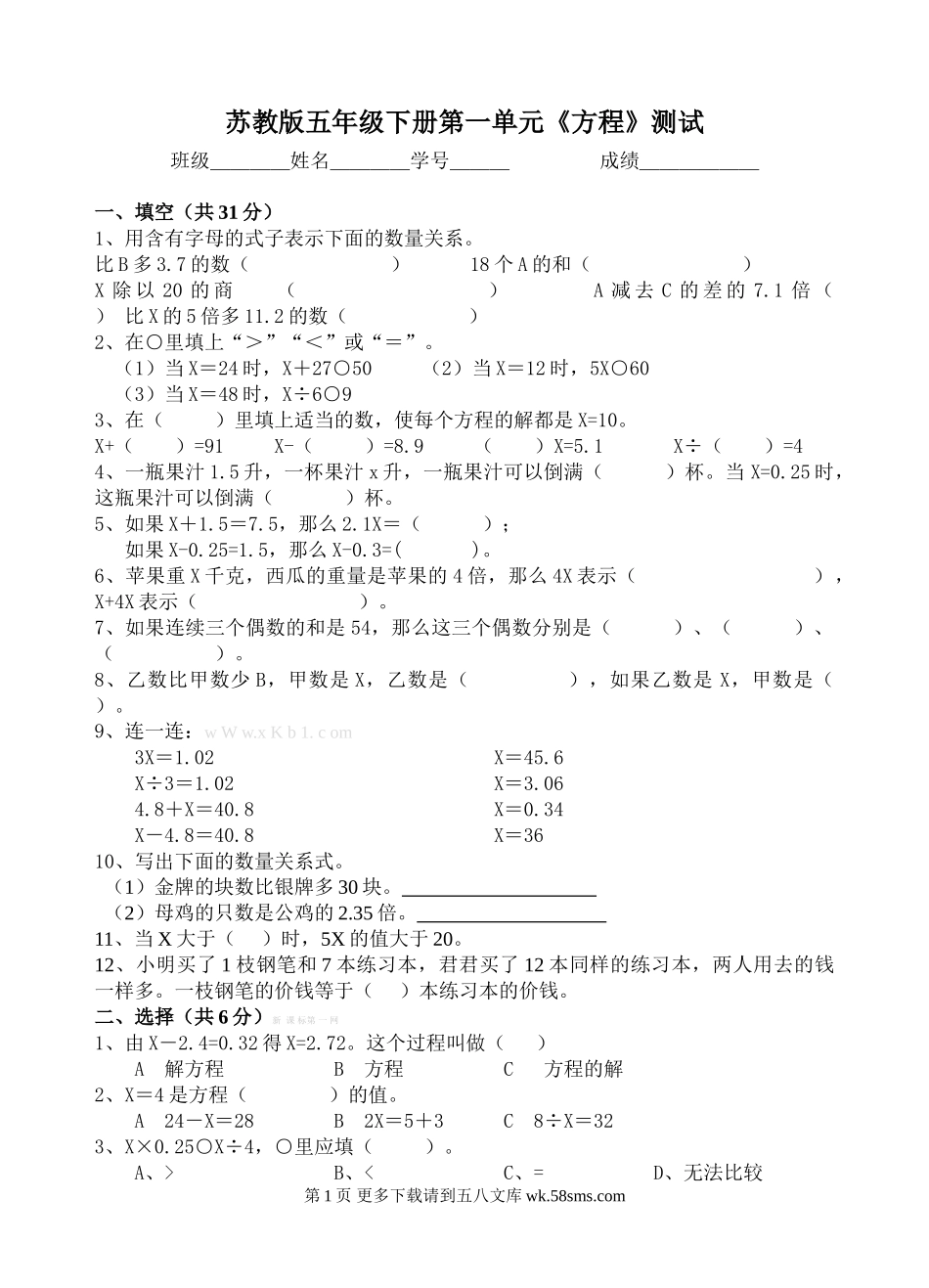 苏教版五年级下册第一单元《方程》测试班级____姓名____学号___成绩______一、填空(共31分)1、用含有字母的式子表示下面的数量关系。比B多3.7的数()18个A的和()X除以20的商()A减去C的差...