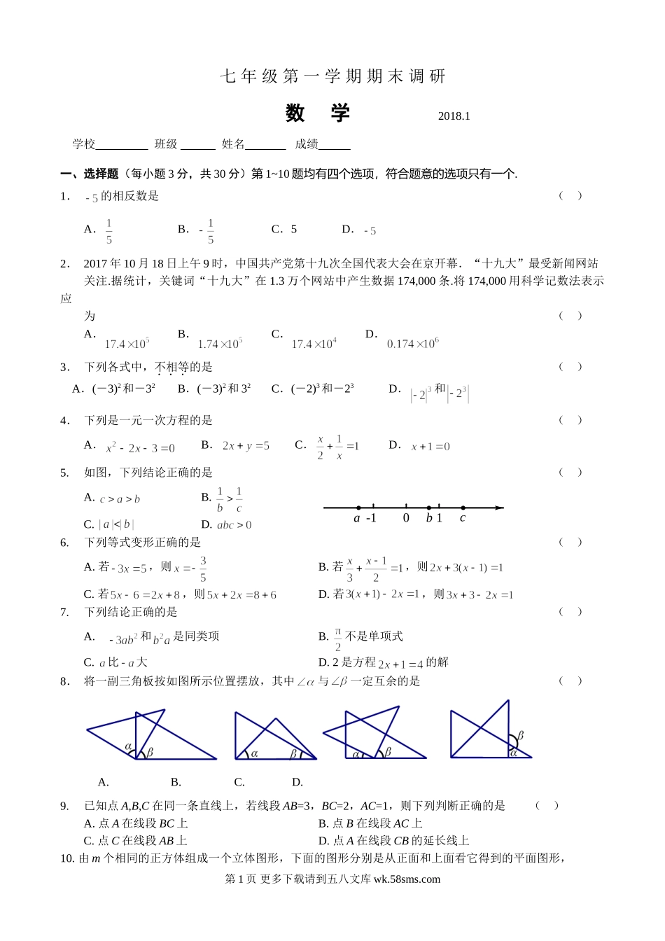 七年级第一学期期末调研数学2018.1学校班级姓名成绩一、选择题(每小题3分,共30分)第1~10题均有四个选项,符合题意的选项只有一个.1.的相反数是()A.B.C.5D.2.2017年10月18日上午9时,中国共产党第十九...