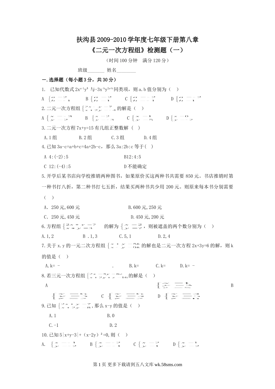 河南周口扶沟09-10学年度七年级下册第八章《二元一次方程组》检测题(一)--数学.doc_第2页
