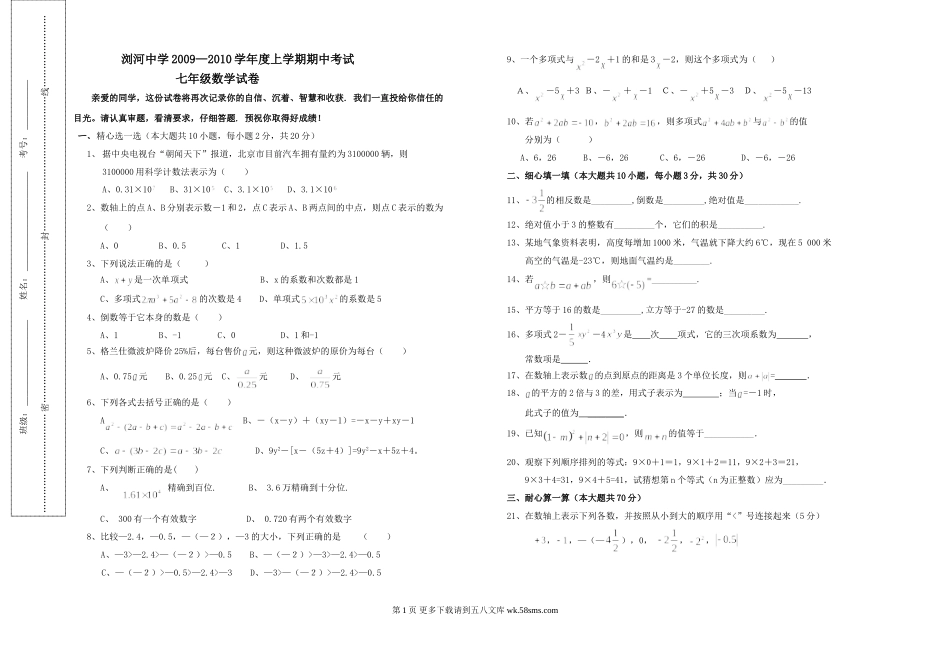 浏河中学2009—2010学年度上学期期中考试七年级数学试卷亲爱的同学,这份试卷将再次记录你的自信、沉着、智慧和收获.我们一直投给你信任的目光。请认真审题,看清要求,仔细答题.预祝你取得好成绩!一、精心选一...