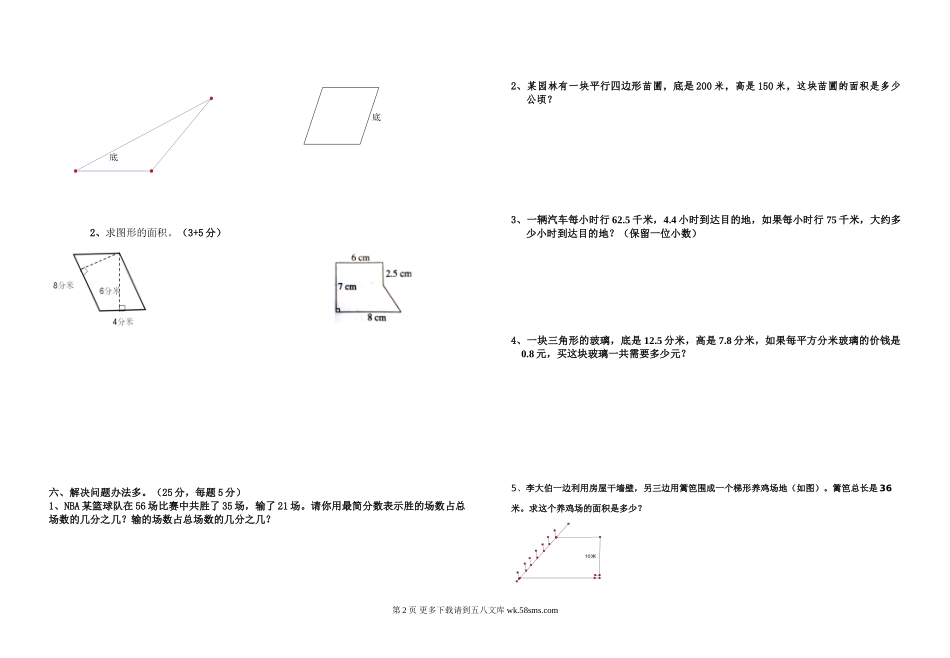 五年级数学期末复习试卷四班级________姓名________成绩______一、我会填。(20分,每题2分)1、4800平方米=()公顷2.5平方千米=()平方米2、在2×8=16中,()是()和()的倍数。3、一个三角形与一个平行四边...