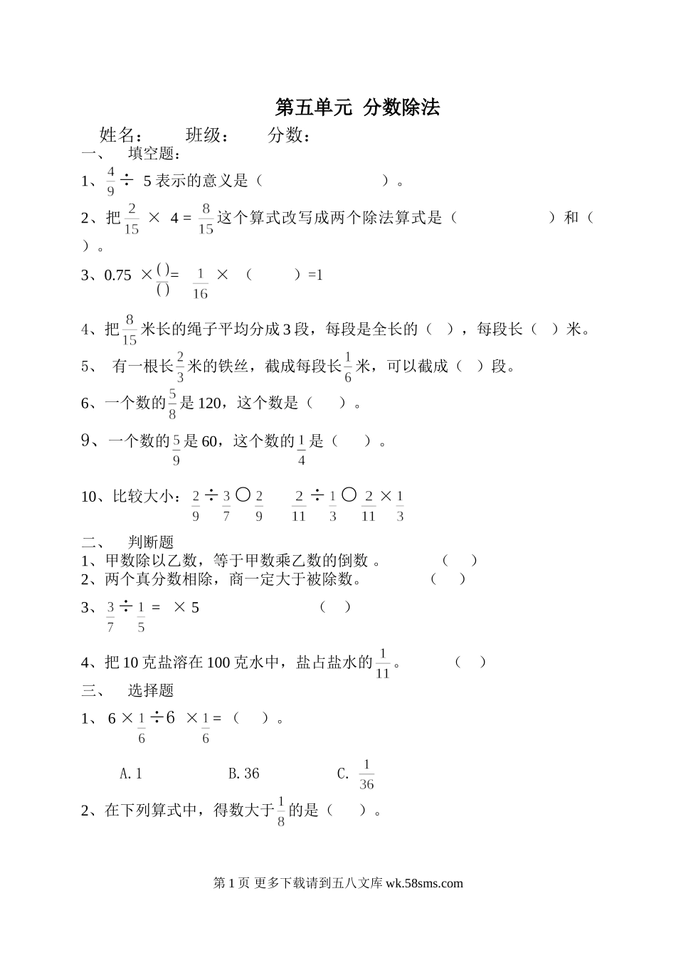 第五单元分数除法姓名:班级:分数:一、填空题:1、÷5表示的意义是()。2、把×4=这个算式改写成两个除法算式是()和()。3、0.75×=×()=14、把米长的绳子平均分成3段,每段是全长的(),每段长()米。...