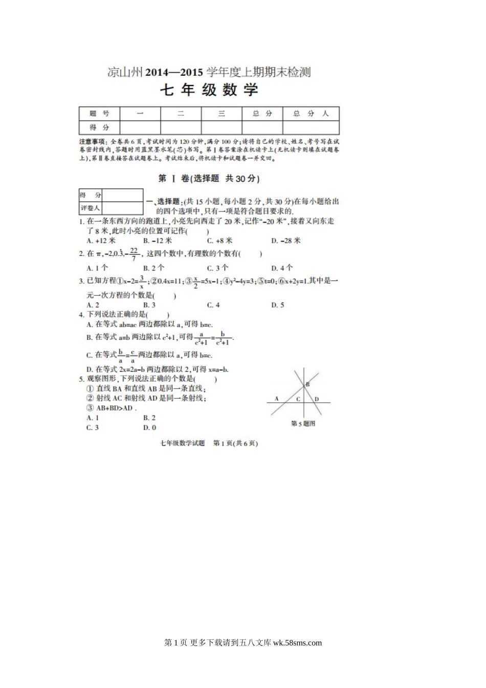 凉山州七年级上期数学期末试题及答案.doc_第1页