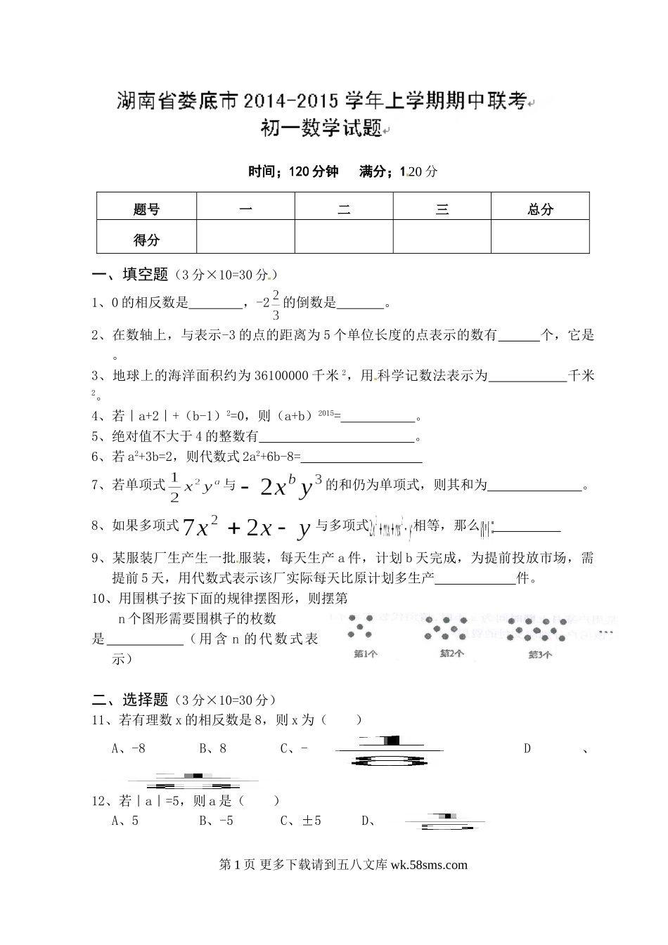 娄底市联考七年级数学期中试卷及答案.doc_第3页