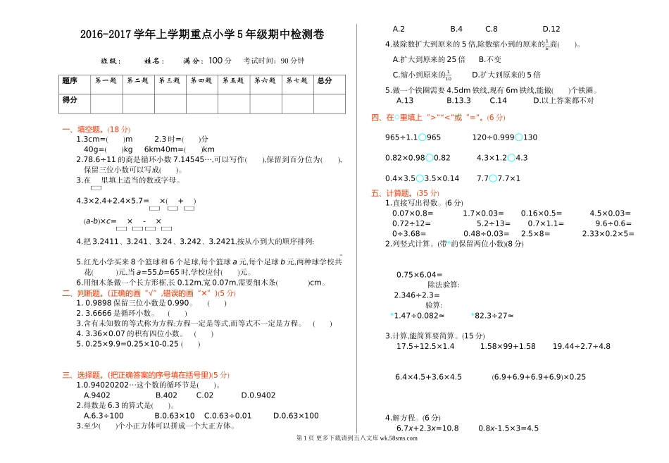 2016-2017学年上学期重点小学5年级期中检测卷班级:姓名:满分:100分考试时间:90分钟题序第一题第二题第三题第四题第五题第六题第七题总分得分一、填空题。(18分)1.3cm=()m2.3时=()分40g=()kg6km40m=()km2.78.6...