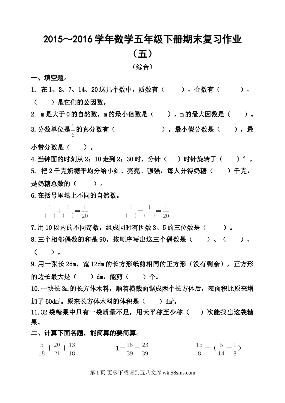 2016小学五年级数学下册期末复习题五 综合.doc_第1页