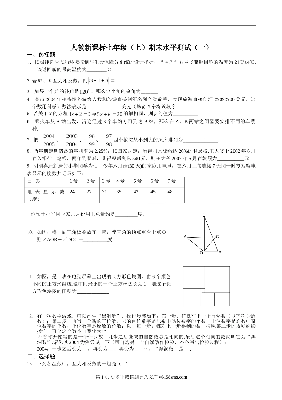 ACOBD人教新课标七年级(上)期末水平测试(一)一、选择题1.按照神舟号飞船环境控制与生命保障分系统的设计指标,“神舟”五号飞船返回舱的温度为21℃±4℃.该返回舱的最高温度为________℃.2.若、互为相反数,...