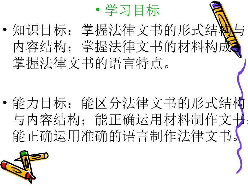 法律文书基础知识之二法律文书基础知识之二法律文书的结构、材料与语言法律文书的结构、材料与语言•学习目标•知识目标:掌握法律文书的形式结构与内容结构;掌握法律文书的材料构成;掌握法律文书的语言特点。...
