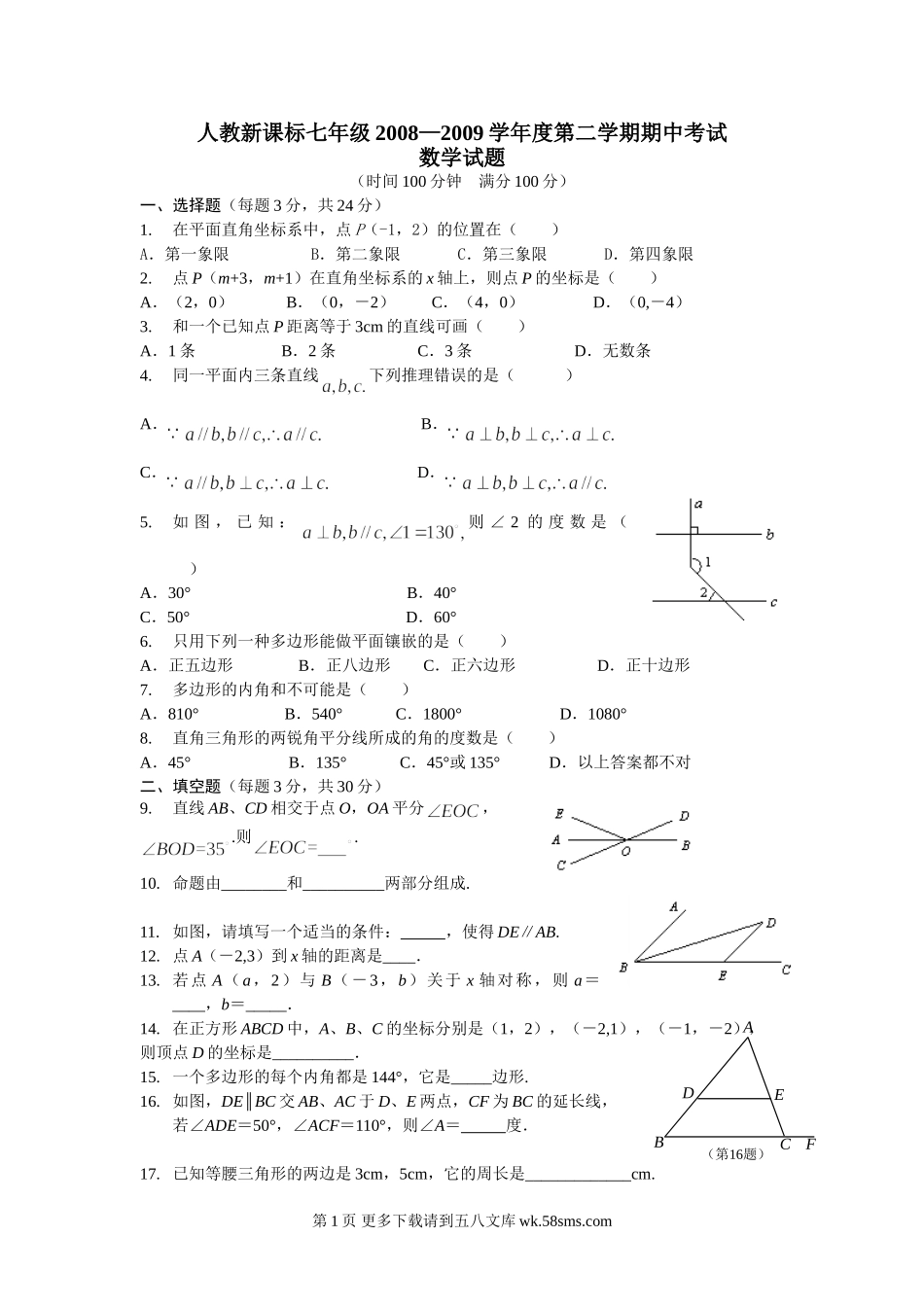 七年级数学08-09学年第二期中考试试题--数学.doc_第1页