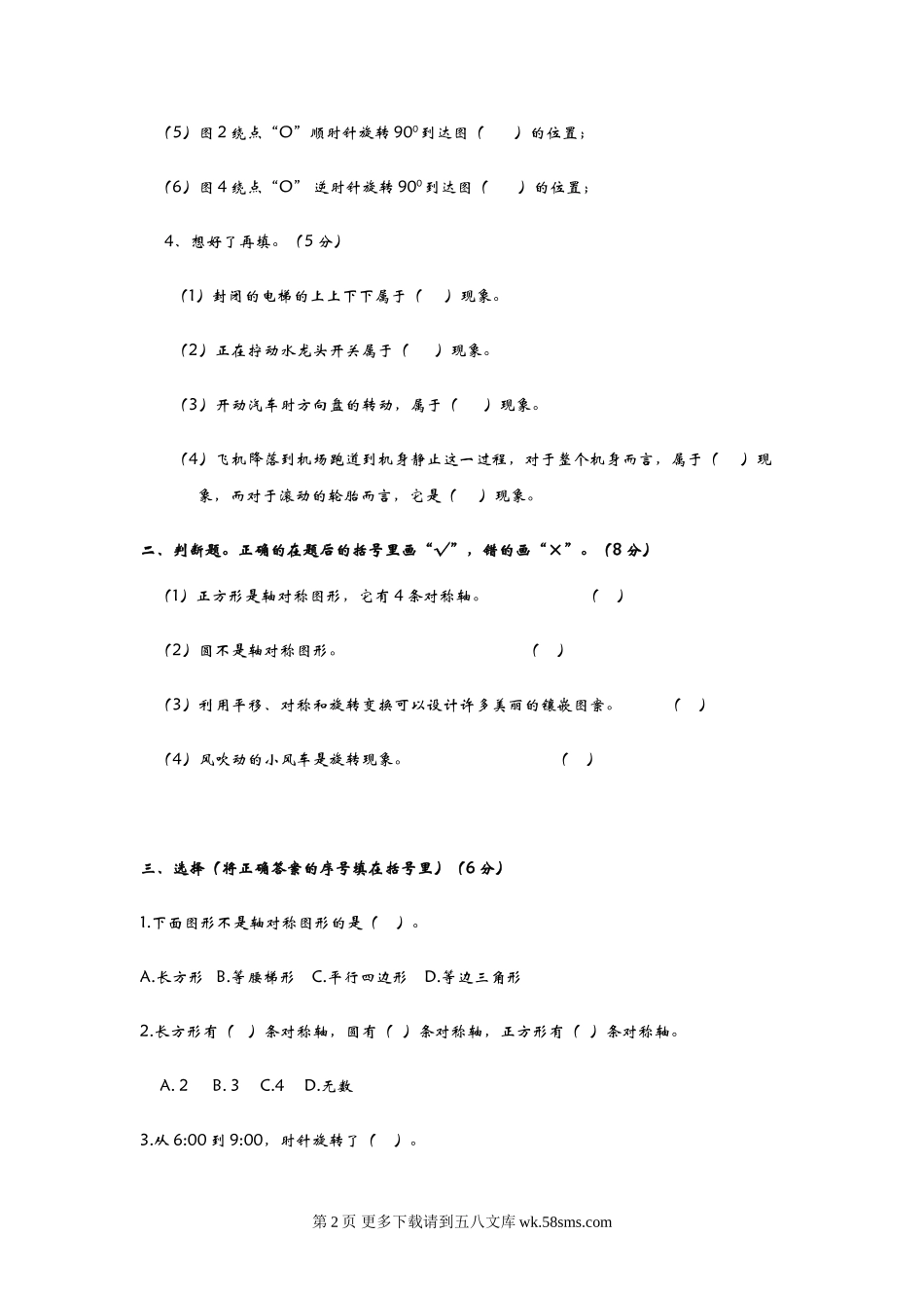 第二单元测试卷(二)一、填空。(35分)1、下面的现象中是平移的画“△”,是旋转的画“□”。(6分)(1)索道上运行的观光缆车。()(2)推拉窗的移动。()(3)钟面上的分针。()(4)飞机的螺旋桨。()...