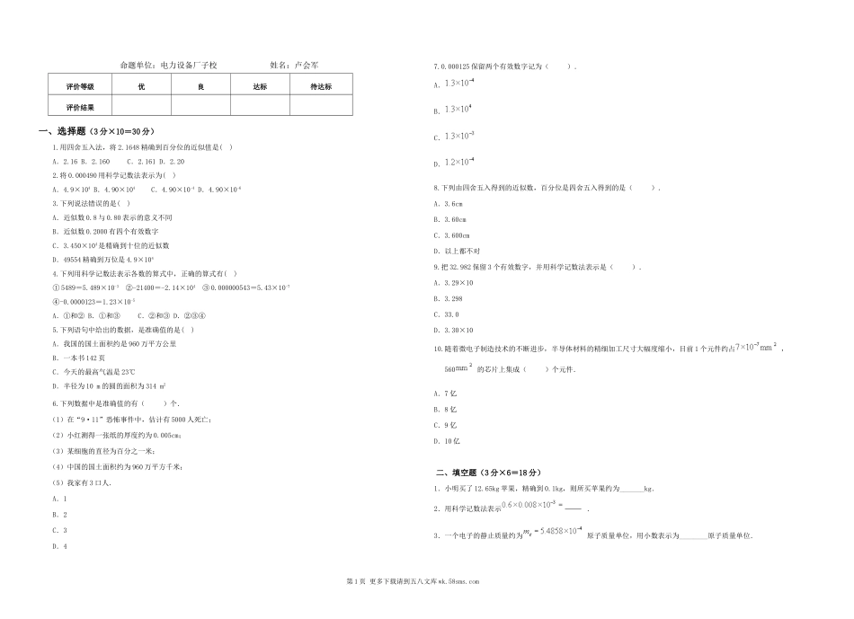 命题单位:电力设备厂子校姓名:卢会军评价等级优良达标待达标评价结果一、选择题(3分×10=30分)1.用四舍五入法,将2.1648精确到百分位的近似值是()A.2.16B.2.160C.2.161D.2.202.将0.000490用科学记数法表...