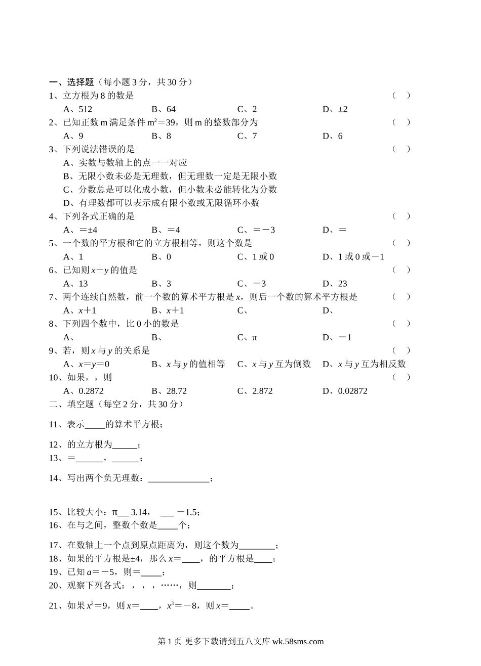 一、选择题(每小题3分,共30分)1、立方根为8的数是()A、512B、64C、2D、±22、已知正数m满足条件m2=39,则m的整数部分为()A、9B、8C、7D、63、下列说法错误的是()A、实数与数轴上的点一一对应B、无限小...