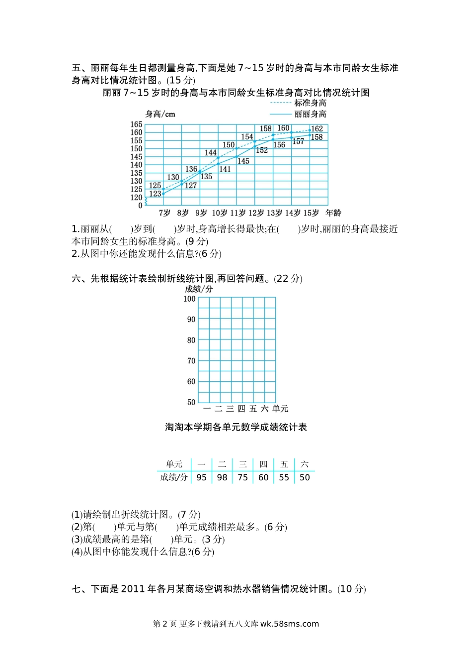 第二单元测试卷(二)时间:90分钟满分:100分分数:一、填空。(16分)1.()统计图不仅可以表示出数量的多少,而且能够清楚地反映数量的增减变化情况。2.折线统计图有()和()两种。3.医生需要检测病人的体温情况,应选用(...