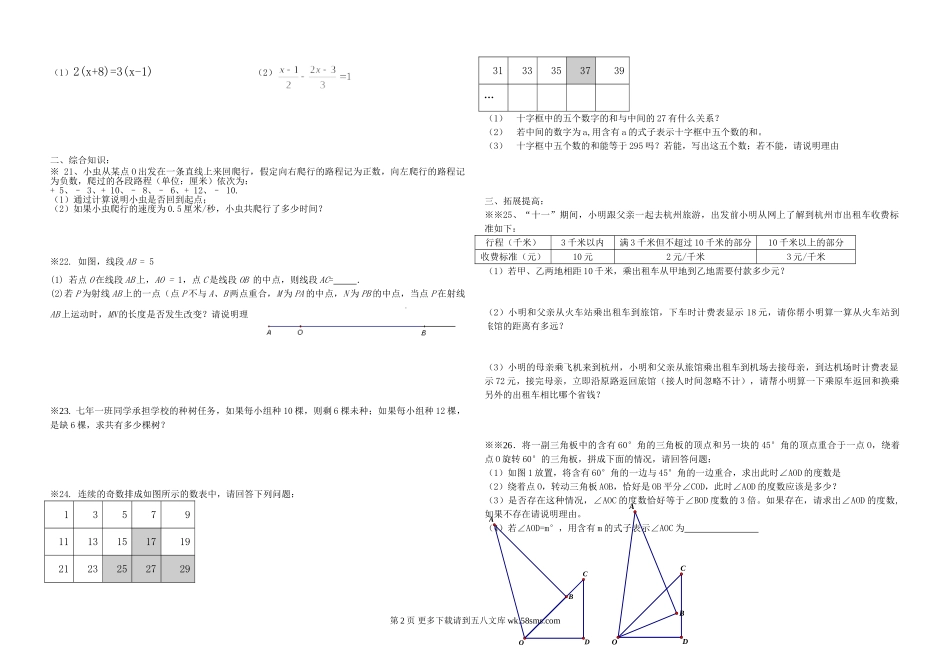 ABCDO一、基础知识:1.下列各数中,在-2和0之间的数是()A.-1B.1C.-3D.32.某洗衣粉包装袋上标有“净重(800±5)克”,则下列质量中合格的是()A.793克B.797克C.807克D.808克3.已知2是关于x的方程3x+a=0的一...