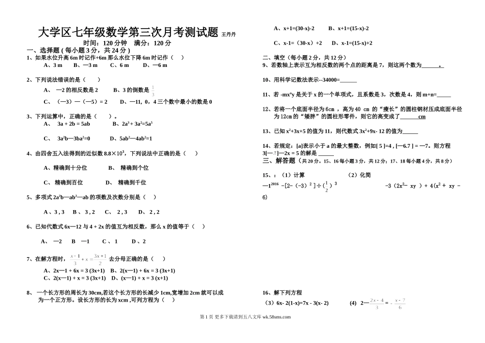 大学区七年级数学第三次月考测试题王丹丹时间:120分钟满分:120分一、选择题(每小题3分,共24分)1、如果水位升高6m时记作+6m那么水位下降6m时记作()A、3mB、—3mC、6mD、—6m2、下列说法错误的是()A、—2的...