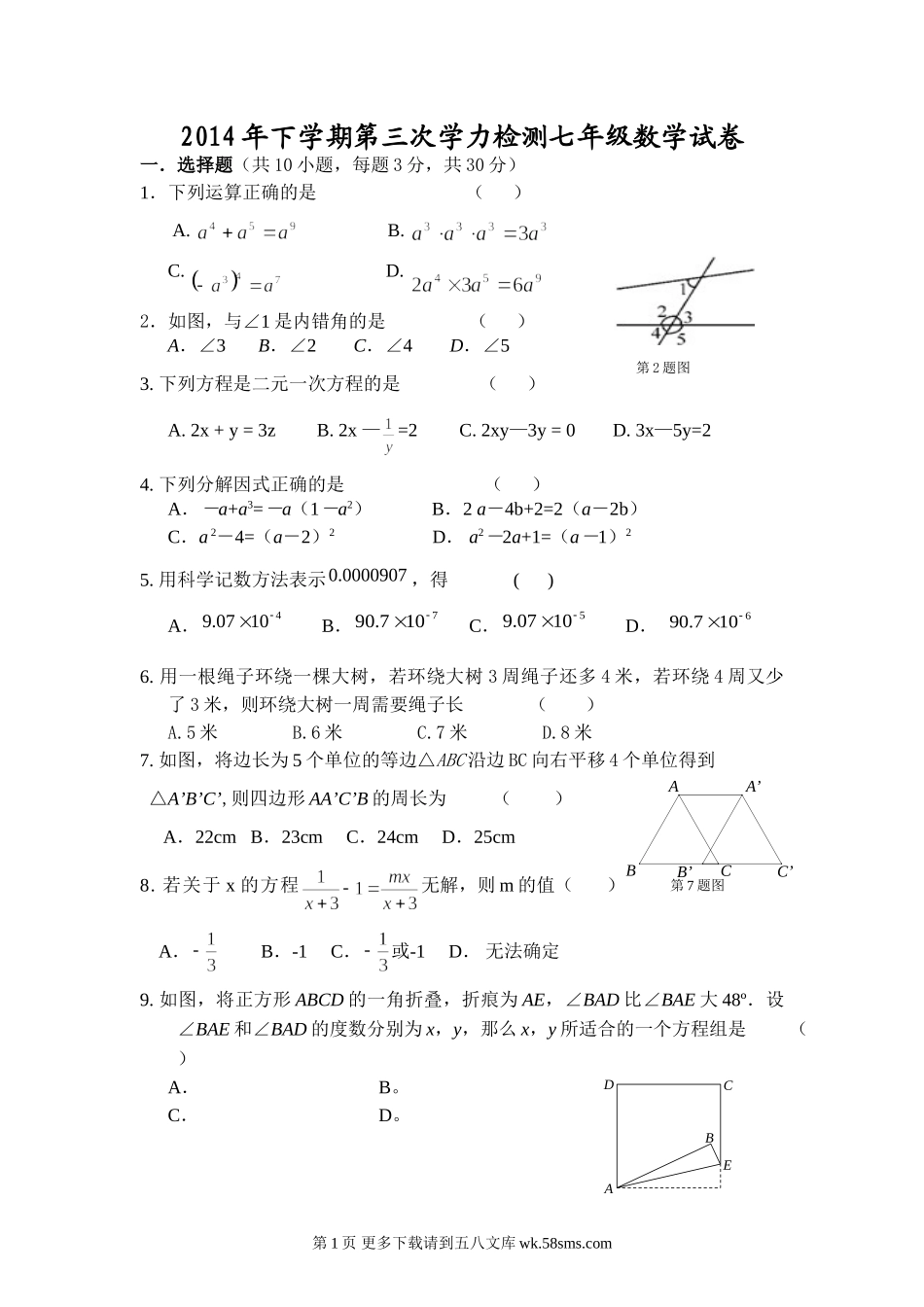 2014年下学期第三次学力检测七年级数学试卷一.选择题(共10小题,每题3分,共30分)1.下列运算正确的是()A.B.C.D.2.如图,与∠1是内错角的是()A.∠3B.∠2C.∠4D.∠53.下列方程是二元一次方程的是()A...