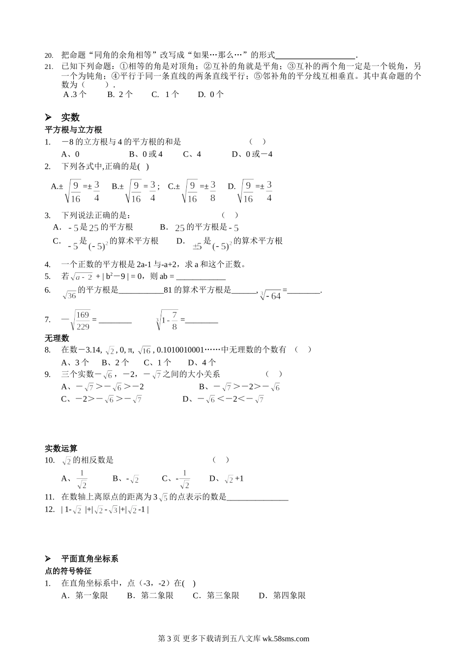 21第六、七讲期中复习相交线与平行线相交线1.以下说法正确的是()A.有公共顶点,并且相等的两个角是对顶角B.两条直线相交,任意两个角都是对顶角C.两角的两边互为反向延长线的两个角是对顶角D.两角的两边分别在同...