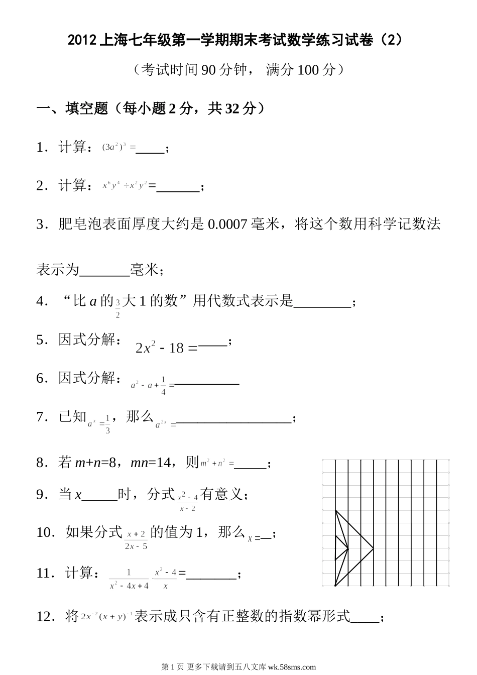 2012上海七年级第一学期期末考试数学练习试卷(2)(考试时间90分钟,满分100分)一、填空题(每小题2分,共32分)1.计算:;2.计算:=;3.肥皂泡表面厚度大约是0.0007毫米,将这个数用科学记数法表示为毫米;...