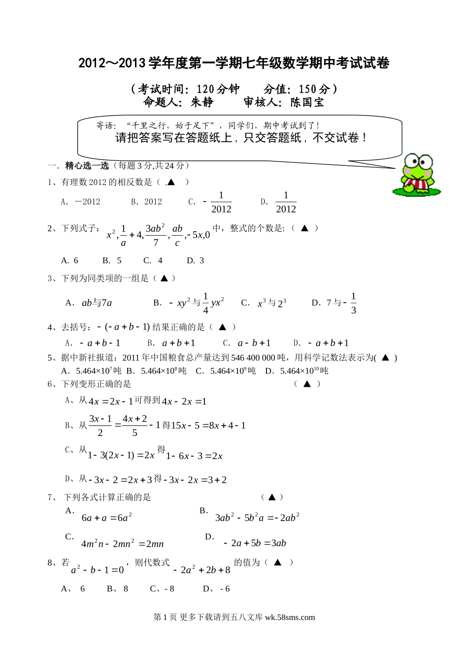 2012~2013学年度第一学期七年级数学期中考试试卷(考试时间:120分钟分值:150分)命题人:朱静审核人:陈国宝一.精心选一选(每题3分,共24分)1、有理数2012的相反数是(▲)A.-2012B.2012C.20121D.201...