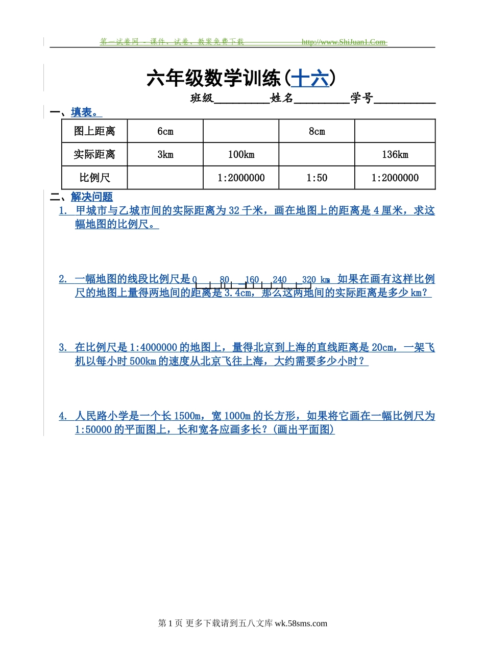 第一试卷网-课件、试卷、教案免费下载http://www.ShiJuan1.Com六年级数学训练(十六)班级_________姓名_________学号__________一、填表。图上距离6cm8cm实际距离3km100km136km比例尺1:20000001:501:2000000二、解...