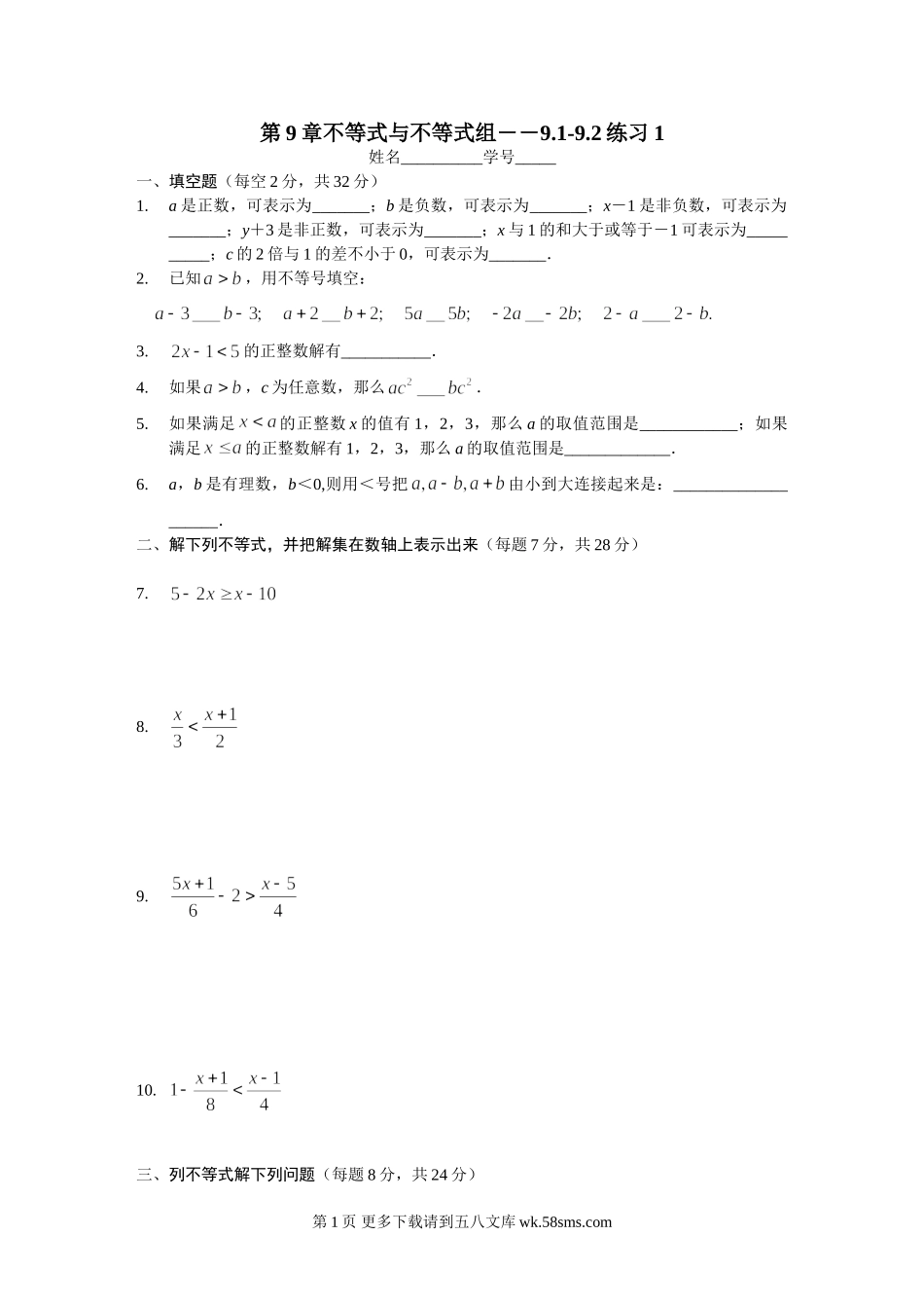 第9章不等式与不等式组――9.1-9.2练习1姓名__________学号_____一、填空题(每空2分,共32分)1.a是正数,可表示为_______;b是负数,可表示为_______;x-1是非负数,可表示为_______;y+3是非正数,可表示为_...