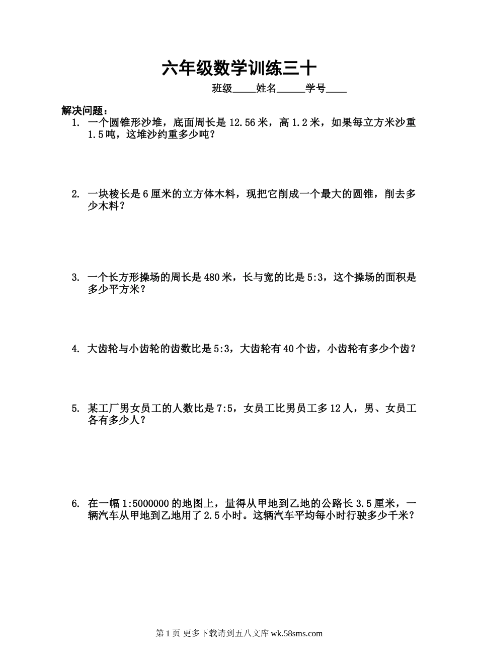 六年级数学训练三十班级姓名学号解决问题:1.一个圆锥形沙堆,底面周长是12.56米,高1.2米,如果每立方米沙重1.5吨,这堆沙约重多少吨?2.一块棱长是6厘米的立方体木料,现把它削成一个最大的圆锥,削去多少木料...