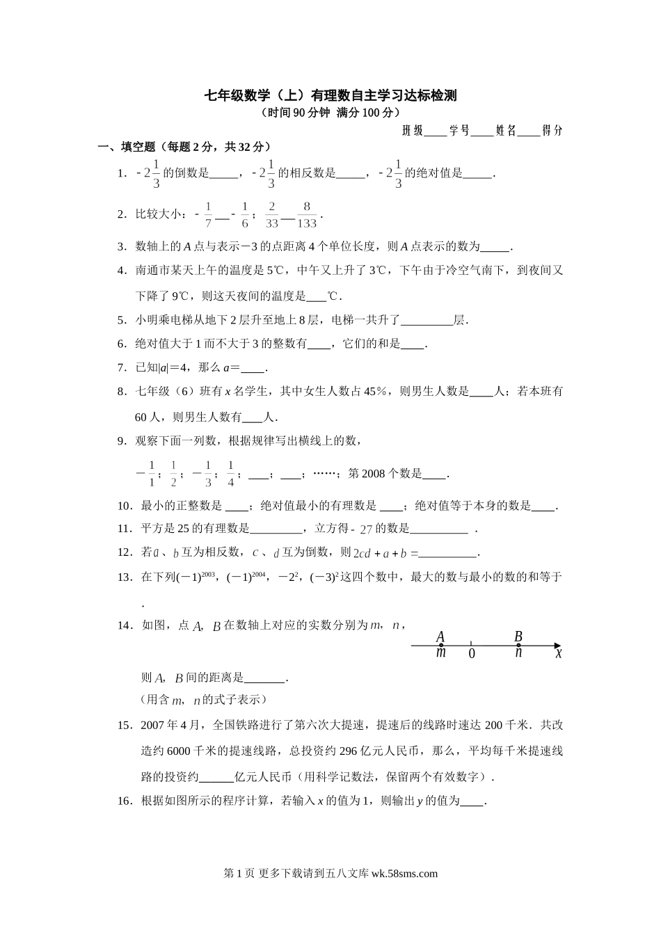 七年级数学(上)有理数自主学习达标检测(时间90分钟满分100分)班级学号姓名得分一、填空题(每题2分,共32分)1.的倒数是,的相反数是,的绝对值是.2.比较大小:;.3.数轴上的A点与表示-3的点距离4个单...