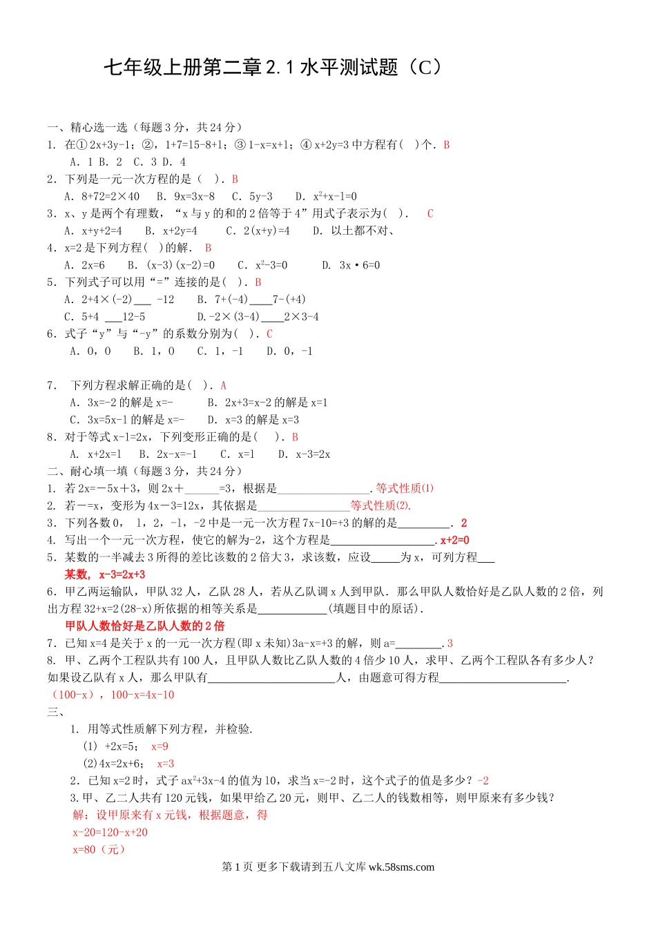 七年级上册第二章2.1水平测试题(C)一、精心选一选(每题3分,共24分)1.在①2x+3y-1;②,1+7=l5-8+l;③1-x=x+l;④x+2y=3中方程有()个.BA.1B.2C.3D.42.下列是一元一次方程的是().BA.8+72=2×40B.9x...