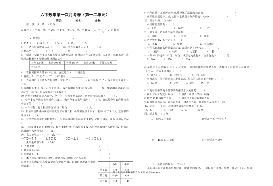 六下数学第一次月考卷(第一二单元)班级:姓名:分数:一、想一想,填一填。(30分)1.在-7,+36,9,―20,―140,+175,0,-1012,1,-中,正数有___________,负数有___________________。2.30÷()=0....