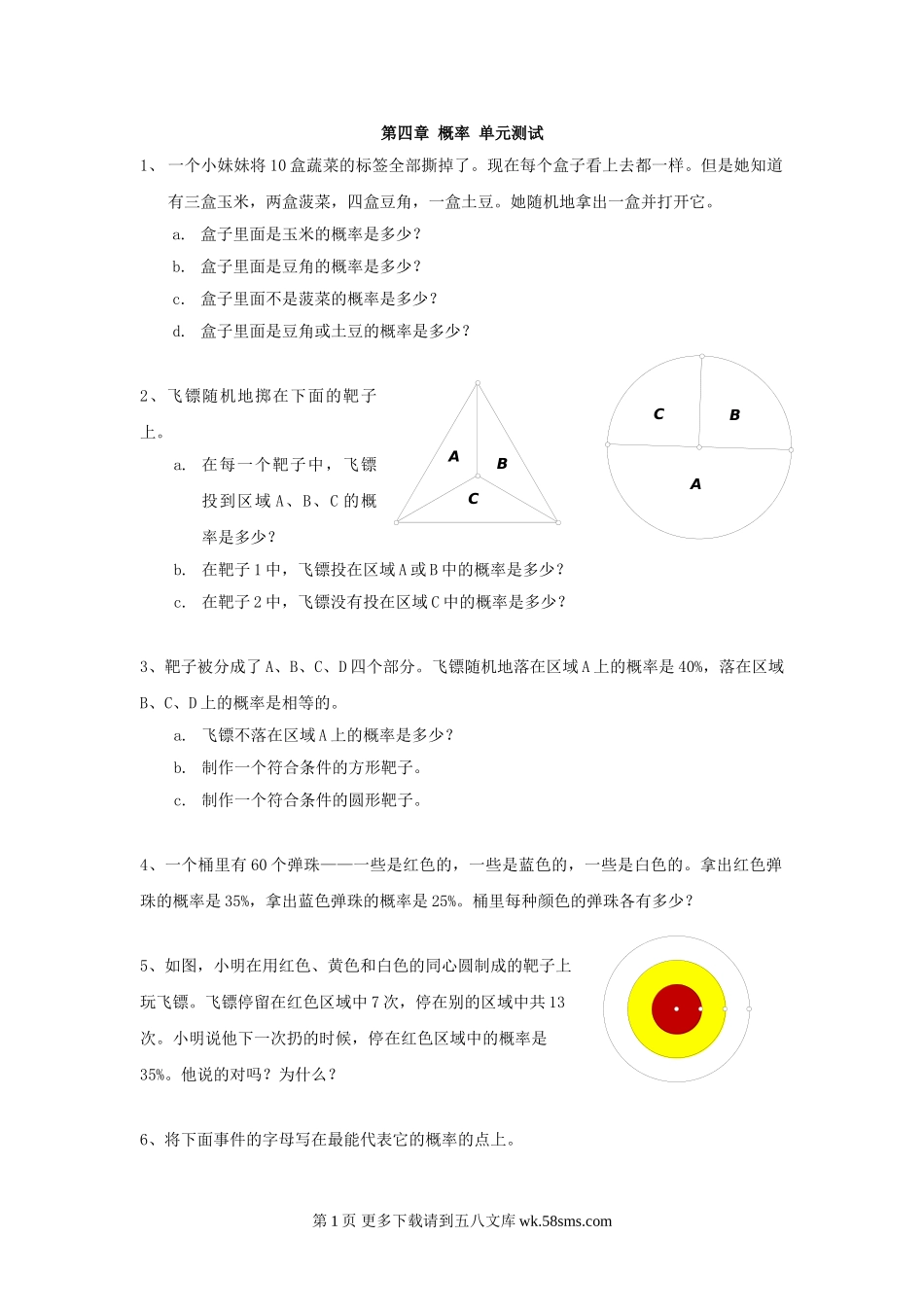 第四章概率单元测试1、一个小妹妹将10盒蔬菜的标签全部撕掉了。现在每个盒子看上去都一样。但是她知道有三盒玉米,两盒菠菜,四盒豆角,一盒土豆。她随机地拿出一盒并打开它。a.盒子里面是玉米的概率是多少?b.盒...