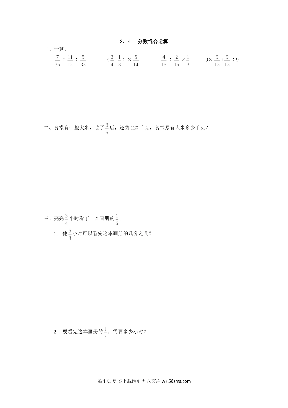 3.4分数混合运算一、计算。÷÷(+)×÷×9×+÷9二、食堂有一些大米,吃了后,还剩120千克,食堂原有大米多少千克?三、亮亮小时看了一本画册的。1.他小时可以看完这本画册的几分之几?2.要看完这本画册的,需...